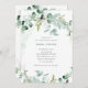 Esta moderna invitación a la ducha de novias incluye una elegante vegetación de eucalipto en color agua, con mucha vegetación, hojas verdes y ramas. Decoran un sencillo fondo blanco con textos clásicos modernos y sutiles salpicaduras de acuarela.