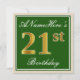 Este sencillo y elegante diseño de invitación para fiestas de cumpleaños incluye un mensaje personalizado como "ANameHere's 21st Birthday" (con el "21st" con un aspecto de color falso/imitación dorado) dentro de un área cuadrada de color verde con un sencillo contorno fronterizo. El nombre se encuentra en un texto elegante de color blanco tipo script, y se puede personalizar. En la parte posterior se incluyen detalles de invitación personalizados. Una invitación para una fiesta de cumpleaños como esta podría ser usada tal vez cuando se invita a la gente a una fiesta de cumpleaños para alguien que está celebrando su 21º cumpleaños. [~Z0000225]