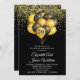 Una elegante invitación de aniversario de bodas dorada sobre fondo negro que presenta globos y confeti dorados y negros con tipografía de escritura blanca contrastada con tipo sans serif clásico. Esta invitación tiene un toque festivo con contraste audaz y estilo moderno. Personalice para cualquier año de aniversario de cumpleaños; 10, 30, 40 o 50.