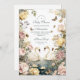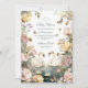 Una romántica invitación a la ducha de bebé con dos elegantes cisnes en un lago de ensueño, rodeada de suaves rosas acuarelas, peonías y mariposas flameantes. Perfecto para celebrar a la futura madre con una temática atemporal y elegante inspirada en el lago Swan.