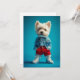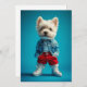 Esta encantadora imagen muestra un territorio blanco de West Highland vestido para impresionar con una chaqueta azul claro de denim, una camiseta blanca, vibrantes pantalones cortos rojos y zapatillas blancas. Esta cachorro elegante, con un fondo azul claro, desprende personalidad y encanto, lo que la convierte en un espectáculo encantador y encantador tanto para los amantes de la moda como de los perros.