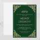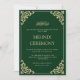 Esta es una elegante y limpia invitación de boda islámica musulmana en verde esmeralda para la ceremonia de henna Mehndi de la feliz pareja. Hay una fuente de escritura dorada formal con una decoración de hoja barroca antigua en la esquina. Vintage. Delicado. Romántico. Puedes personalizar esta plantilla imprimible con la ayuda de la herramienta de diseño en el lado derecho. También puedes editar los nombres de la pareja, el estilo y tamaño de la fuente. El texto está escrito en letras mayúsculas. Celebra tu día especial enviando esta invitación o compártela como descarga instantánea. Papelería de boda de elegancia atemporal. Incluye sobre blanco para ti.