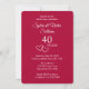 Personalice esta elegante y sencilla invitación para la fiesta del 40 aniversario de boda añadiendo los nombres de la pareja y los detalles de la fiesta. Mis corazones entrelazados diseñados originalmente acentúan el moderno y elegante "40 años". Personalice esta tarjeta roja rubí con tipografía de moda para sus fines. También puede cambiar el número para un aniversario de 25 años personalizado, o 10 aniversario de boda, 50 o 60 o cualquier aniversario. Esta sería una hermosa y romántica invitación para la fiesta de aniversario de boda. Vea mi colección para decoración de mesa y cristalería de boda de aniversario de 40 años de boda en rojo rubí.