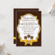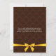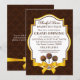 © Diseños Socialite. Nuestra invitación de panadería elegante tiene un fondo de damasco marrón chocolate, un hermoso banner de texto con dorado y marrón, tres cake pops y un diseño de cinta y lazo de satén dorado falso. Si necesita ayuda para personalizar esta invitación de gran inauguración para su evento, no dude en contactar a Diseños Socialite con sus requisitos.