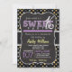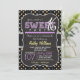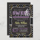 Cute Sweet 16, dieciséis, invitación a estrellas amarillas, negras y grises, patrón nocturno estrellado con elementos de diseño de ric púrpura. 16°, 16° cumpleaños, invitación para chicas. Los tipos de tiza amarilla y púrpura de color vintage se perciben en el fondo de la pizarra.