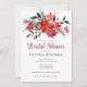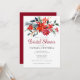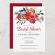 Esta preciosa invitación a la ducha de Navidades con novia cuenta con una hermosa acuarela de flores rojas de poinsettia y hojas de pino para las vacaciones. Una elegante ducha de bodas de invierno con un respaldo rojo festivo para las vacaciones.