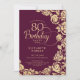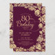 Invitación a la fiesta de cumpleaños número 80 de la floral de oro de Borgoña. Diseño elegante con rosas, Relieve metalizado de oro falso y tipografía tipo guión. La carta de invitación a la moda es perfecta para una elegante celebración de cumpleaños femenina. Se puede personalizar a cualquier edad. Personaliza con tus propios detalles. Invitaciones Zazzle impresas o una plantilla imprimible digital de descarga instantánea.