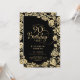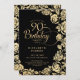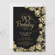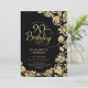 Invitación a la fiesta de cumpleaños número 90 de la floral de oro negro. Diseño elegante con rosas, Relieve metalizado de oro falso y tipografía tipo guión. La carta de invitación a la moda es perfecta para una elegante celebración de cumpleaños femenina. Se puede personalizar a cualquier edad. Personaliza con tus propios detalles. Invitaciones Zazzle impresas o una plantilla imprimible digital de descarga instantánea.