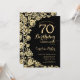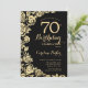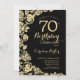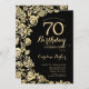 Invitación a la fiesta de cumpleaños 70 de Black Gold Floral. Diseño elegante con rosas, Relieve metalizado de oro falso y tipografía tipo guión. La carta de invitación a la moda es perfecta para una elegante celebración de cumpleaños femenina. Se puede personalizar a cualquier edad. Invitaciones Zazzle impresas o una plantilla imprimible digital de descarga instantánea.