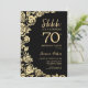 Invitación a la fiesta de cumpleaños número 70 de Black Gold Floral Surprise. Diseño elegante con rosas, Relieve metalizado de oro falso y tipografía tipo guión. La carta de invitación a la moda es perfecta para una elegante celebración de cumpleaños femenina. Se puede personalizar a cualquier edad. Invitaciones Zazzle impresas o una plantilla imprimible digital de descarga instantánea.