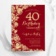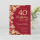 Invitación a la fiesta de cumpleaños 40 de la floral dorada roja. Diseño elegante con rosas, Relieve metalizado de oro falso y tipografía tipo guión. La carta de invitación a la moda es perfecta para una elegante celebración de cumpleaños femenina. Se puede personalizar a cualquier edad. Invitaciones Zazzle impresas o una plantilla imprimible digital de descarga instantánea.