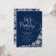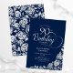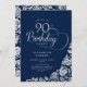 Sencilla y elegante invitación a la fiesta de cumpleaños número 90 en la marina y la plata. Diseño elegante con rosas, Relieve metalizado falso plateado y tipo de letra de guión tipográfico. La carta de invitación a la moda es perfecta para una elegante celebración de cumpleaños femenina. Personaliza con tus propios detalles. Se puede personalizar a cualquier edad. Invitaciones Zazzle impresas o una plantilla imprimible digital de descarga instantánea.