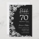Sorpresa floral de plata negra 70 invitada a la fiesta de cumpleaños. Diseño elegante con rosas, Relieve metalizado falso plateado y tipo de letra de guión de tipografía. La carta de invitación a la moda es perfecta para una elegante celebración de cumpleaños femenina. Se puede personalizar a cualquier edad. Invitaciones Zazzle impresas o una plantilla imprimible digital de descarga instantánea.