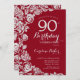Invitación a la fiesta de cumpleaños 90 con flores de plata roja. Diseño elegante con rosas, Relieve metalizado falso plateado y tipo de letra de guión de tipografía. La carta de invitación a la moda es perfecta para una elegante celebración de cumpleaños femenina. Se puede personalizar a cualquier edad. Invitaciones Zazzle impresas o una plantilla imprimible digital de descarga instantánea.