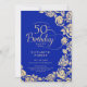 Invitación a la fiesta de cumpleaños 50 de la floral de oro azul real. Diseño elegante con rosas, Relieve metalizado de oro falso y tipografía tipo guión. La carta de invitación a la moda es perfecta para una elegante celebración de cumpleaños femenina. Se puede personalizar a cualquier edad. Personaliza con tus propios detalles. Invitaciones Zazzle impresas o una plantilla imprimible digital de descarga instantánea.