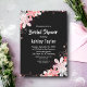 Esta elegante ducha de novia florida es perfecta para una moderna ducha de novias de verano. El diseño es sencillo y está decorado con flores rosadas florecientes, con una tipografía blanca elegante sobre un fondo negro atrevido.