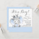 Invitaciones a la ducha de bebés elefantes con un adorable elefante de bebé usando una corona azul y plata de bonito sentado en un fondo de punto azul. Estas invitaciones a la ducha de bebé de elefantes para niños se personalizan fácilmente para tu evento simplemente añadiendo tus detalles. Puede quitar la corona y quitar el fondo de la parte posterior.
