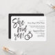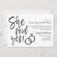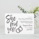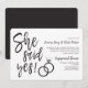 Una divertida y única invitación con letras escritas a mano adaptada específicamente a su fiesta o cena de compromiso amistosa. Cuenta con las palabras "¡Ella dijo que sí!" con anillos de boda descansando al lado. Hacia un lado de esto hay espacio para los detalles únicos de su fiesta o evento.