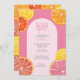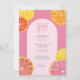 Frutos de cítricos caprichosos en rosa, coral, naranja y rubio color pomelo rojo. Las rodajas de cítricos dibujadas a mano incluyen una textura pintada con acuarela para añadir jugosa a una colorida invitación a la ducha de boda.