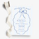 Elegante invitación a la ducha de novias con un marco de cinta ovalada ondulada dibujada a mano con un arco. El titular editable "ella está atando el nudo" es de estilo azul escrito a mano en un fondo rayado azul y blanco.