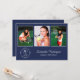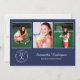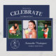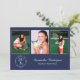 Personalice su fiesta de graduación con invitaciones personalizadas. Reemplace las 3 fotos de muestra con las suyas. Agregue el año al elegante emblema blanco debajo de las fotografías en la parte frontal que dice "GRADUADO DE LA CLASE DE [AÑO]" con el nombre de su graduado y la escuela al lado en elegantes fuentes de escritura y serif blancas sobre fondo azul marino. Reemplace el texto de muestra blanco en la parte trasera azul marino de la invitación para su evento. Personalícelo para cualquier graduado: escuela secundaria, universidad, escuela de posgrado, facultad de derecho, facultad de medicina, escuela de oficios.