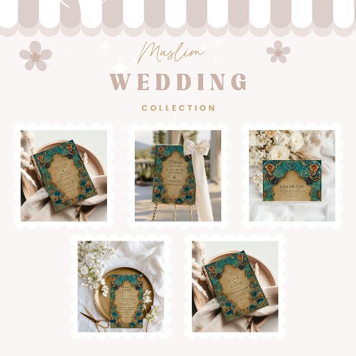 An opulent Islamic wedding design featuring a teal and gold arched frame inspired by mosque architecture and Persian artistry. With intricate floral motifs and geometric symmetry, this invitation exudes elegance, spirituality, and timeless cultural refinement — ideal for a luxurious Islamic wedding.