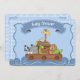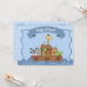 Invitación en Baby Shower del Arca de Blue Noah para niños. El diseño tiene un fondo azul claro y dorado, un arca lleno de animales y un cartel con las palabras "baby ducha".