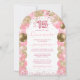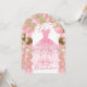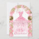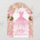 Esta elegante invitación de Quinceañera incluye un vestido de purpurina brillante de color rosa rodeado por un arco de globo rosa y dorado. Las fusiles en caída y los confeti en fondo dorado y rosa completan la vibra fiesta. Añadir nombre y edad para personalizar. En la parte posterior se muestra el arco de globo, las bobinas, los confetti y el texto de personalizable para los detalles de su fiesta.