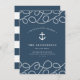Nuestras invitaciones en movimiento de moda costera en azul marino presentan cuerda náutica blanca con el ilustracion de ancla de un barco. "¡Hemos dejado el ancla!" aparece encima de los nuevos detalles de tu dirección con letras de estilo náutico.