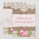 ¡Haga clic en "¡Personalízalo!" para mover/ajustar el texto y los colores! ¡Para la novia rústica/country que será! Una forma elegante de pedirle a tus chicas que te acompañen en el gran día. Con arpillera y encaje con rosas y peonías rosadas. Invitaciones, tarjetas para la fiesta de boda, franqueo, sobres y más también disponibles en mi tienda. ©2015 Weddings*n*Whimsy