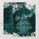 El fondo de esta tarjeta está cubierto con un gráfico desgastado de textura vintage en color verde oscuro que incorpora toques de textura de madera, tela de arpillera, marcas rayadas y bordes de encaje sutiles. Estaba adornado con gráficos que representan hileras de luces centelleantes, rociados florales de acuarela blanca y acentos de encaje. Usando una fuente de escritura a mano moderna, creé una imagen gráfica tipográfica simple que dice "¡Nos escapamos!". Esta es una forma única y audaz de anunciar su matrimonio e invitar a la tribu a su recepción o evento de celebración posterior a la boda. Sus datos personales se agregan fácilmente para personalizar esta plantilla tanto como desee. Todas las capas están desbloqueadas para permitirle todo el control que necesite.