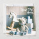 Una acogedora y encantadora sala infantil con un oso de peluche gris, un mecedor de madera blanca y azul y varios bloques de edificios azules y blancos. La sala está decorada en una agradable paleta de tonos azules y blancos, lo que proporciona un ambiente tranquilo y acogedor para jugar y relajarse