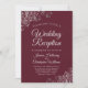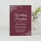 Estas hermosas invitaciones de boda están diseñadas para los invitados que solo están invitados a la recepción, pero no a la ceremonia real. Presentan un diseño simple pero elegante con volantes de encaje de lámina plateada falsa sobre un fondo de color burdeos, granate o rojo vino con letras de escritura elegante y un dorso mármol plateado gris.