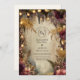 Un diseño rico y monótono inspirado en un bosque otoñal al atardecer, enmarcado con helechos dorados, flores de borgoña y brillantes luces de cuerda. Perfecto para crear un ambiente romántico y mágico para su celebración.