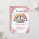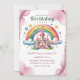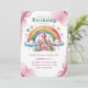 A delightful and whimsical birthday invitation featuring a pastel fairytale castle beneath a vibrant rainbow arch. Surrounded by sparkling stars, fluffy clouds, and watercolor floral accents, this enchanting design creates a dreamy celebration atmosphere. The card text invites guests to a birthday party and includes the message “Estelle Darcy is turning 10!” in elegant script. Perfect for kids who love magical themes, princess castles, and colorful fantasy artwork.