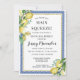 A Encontró su principal brunch de limón y tema de burbujas es la perfecta ducha de novias de verano. La fruta fresca y fresca de cítricos siempre crea hermosas muestras y refrescos. La colección Lemons del Jenny se encarga de los limones acuarelas de moda y los une con azulejos azules mediterráneos. En este diseño los azulejos crean un marco azul. Un delgado marco dorado lo eleva. Dos ramos de limón aportan un toque floral. Ella encontró que su principal apretón está escrito en la parte superior. El resto del brunch y los detalles burbujeantes siguen.