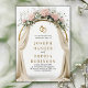 Engagement party invitation with elegant floral arch design. Features pink and white flowers, green leaves, and gold rings. Names and details in gold text.