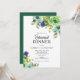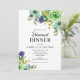 Esta elegante invitación de la Cena de Ensayos cuenta con una acuarela gráfica de flores verde azuladas, limas verdes y moradas y una hermosa vegetación. El texto se acentúa con un tipo de letra manuscrito.