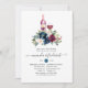 Cena de boda acuarela, invitación a catar vinos con peonías azul marino, blanco y rojo marrón y rosas con tipografía elegante de escritura a mano.