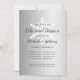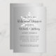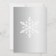 Un diseño sencillo pero elegante con un copo de nieve blanco sobre fondo plateado, con las palabras "Cena ensayada" y los nombres de la novia y el novio con escritura gris carbón, y el texto restante en letra sans serif. El diseño del copo de nieve se repite al revés.