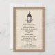 Una invitación a un boda monograma para una cena con un ilustracion de una linterna llena de un arreglo floral con un esquema de color lavanda. Personaliza el texto con detalles de tu ocasión. El fondo está inspirado en el diseño de encajes en la parte delantera.