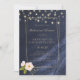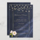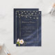Fondo azul marino artístico + marcos dorados geométricos + cuerdas de luces + flores rosa rubor hacen una elegante invitación a la cena de ensayo durante todo el año. Para cambiar el texto, utilice la opción de personalización. Para obtener cambios de texto más extensos, como cambios en el tipo de letra, color de fuente o tamaño y diseño del texto, elija la opción personalizar. **Las plantillas coordinadas para este conjunto de bodas se pueden encontrar en la colección que se muestra a continuación o pegando esta URL en su navegador: https://www.zazzle.com/collections/modern_blush_pink_gold_navy_blue_floral_wedding-119625208205037116?rf=238919973384052768&CMPN=share_dclit&lang=en&social=true
