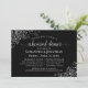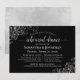 Esta hermosa cena de ensayo es a la vez sencilla y elegante. Presenta un texto gris sobre un fondo negro con Relieves metalizados falsos de plata lacada en las esquinas. Dispone de información tanto sobre el ensayo boda como sobre la cena de celebración que sigue. Perfecto para mantener la fiesta nupcial informada sobre todas las festividades pre-bodas.