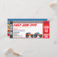 Viaje para la carrera de camiones de monstruo 5 cumpleaños diseñado como entrada VIP con coloridos camiones monstruo y bandera a cuadros.