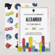 Trae la emoción de los cómics al día especial de tu hijo con esta atrevida invitación de cumpleaños de superhéroes para niños. Diseñada con un divertido tema de estilo cómic, esta invitación personalizable es perfecta para niños que aman la acción, los héroes y la aventura. Personalízala con el nombre de tu hijo, edad, detalles de la fiesta y haz que sea única para él. Ideal para cumpleaños con tema de superhéroes, esta invitación establece el tono para una celebración épica que tu pequeño héroe y sus amigos nunca olvidarán.