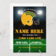¡Prepárate para anotar a lo grande con este diseño de cumpleaños fanático del fútbol! Imagina un telón de fondo de 50 yardas, con un casco de fútbol adornado con los colores de tu equipo favorito, amarillo y verde, por supuesto. Personalízalo con los detalles de tu fiesta para ese toque único. Disponible como invitaciones imprimibles y descargas instantáneas para una reproducción fiesta ganadora!