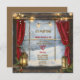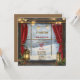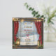 Escena de invierno vista por una ventana vintage con invitación a un fiesta de Navidades familiares Disfrute de la tranquilidad de esta invitación con nieve al aire libre, cortinas rojas y lámparas iluminadas con luces suavemente brillantes