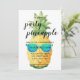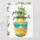 A todos les encanta una fiesta, especialmente una fiesta de Verano. Sorprenda a sus invitados con este caprichoso diseño tropical con una piña con gafas de fiesta para una invitación verdaderamente divertida y juguetona. La parte posterior presenta exuberantes hojas verdes que se ajustan al tema tropical.