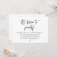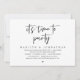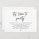 Tarjeta de invitación de boda íntima con tema de guion en blanco y negro moderno (es hora de fiesta). Es perfecta para su recepción de boda íntima / fiesta de celebración post-boda. Agregue sus detalles en fuente / letra negra coincidente.