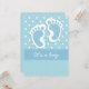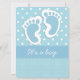 Esta invitación de la fiesta de bienvenida al bebé ofrece un diseño de dos huellas del bebé azul, en un fondo azul y blanco variado del lunar. La raya de centro tiene detalles de costura, y personalizable "es texto de un muchacho". El fondo azul en la parte posterior, y el texto informativo, se pueden modificar para requisitos particulares según lo deseado.